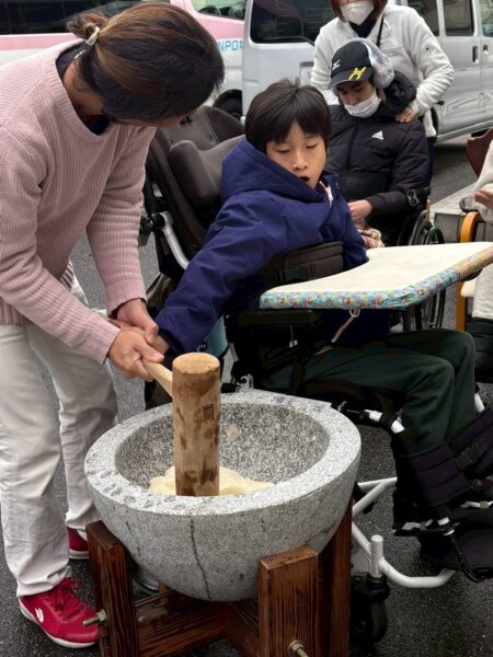 なないろ恒例の古き良き石臼、大小揃えた杵(きね)を用いて思いっきりお餅をついて頂きました。